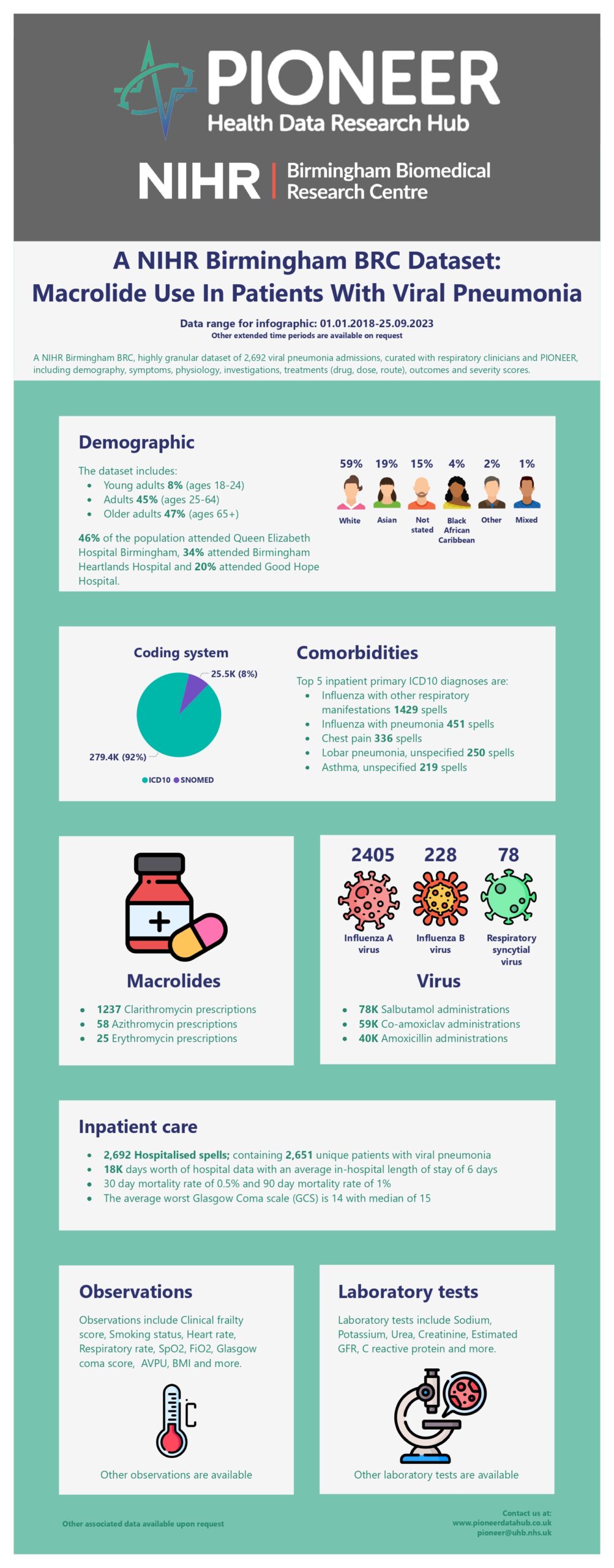 PIONEER and the NIHR Birmingham BRC Infections and Acute Care theme have curated a highly granular dataset of 2,692 viral pneumonia admissions, working with Respiratory specialists. The data includes demography, serial physiology, investigations, treatments (drug, dose, route), diagnostic codes (ICD-10 & SNOMED-CT), initial presentation, presenting symptoms, outcomes, and several severity scoring systems including National Early Warning Score (NEWS2), Clinical Frailty Score (CFS), Glasgow Coma Score (GCS) and AVPU score (Alert, Voice, Pain, Unresponsive). It also includes results from viral swabs and standard microbiological tests.
