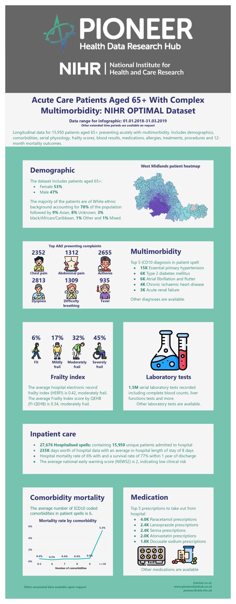 PIONEER has curated this dataset of 15,950 patients aged 65 and over with multimorbidity who were acutely admitted to hospital and had an inpatient stay. It contains longitudinal data on serial physiology readings, frailty scores, blood results, medications, comorbidities, drug allergies, treatments, procedures, and mortality outcomes up to a year post-discharge. While this subset focuses on older adults, a full dataset covering all ages is also available.