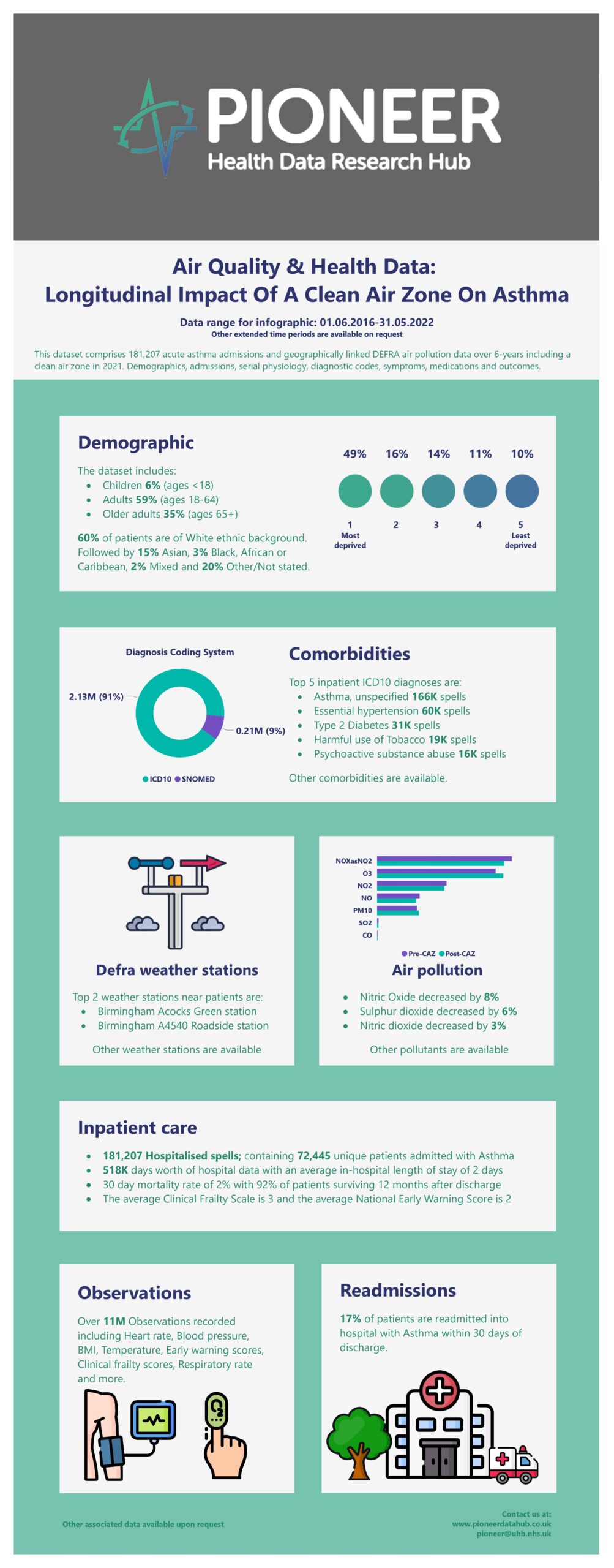 This dataset, curated by PIONEER, encompasses a detailed collection of 181,207 asthma admissions from 1st June 2016 to 31st May 2022, offering a comprehensive analysis tool for researchers examining the effects of air quality on respiratory health. It includes extensive patient demographics, serial physiological measurements, assessments, diagnostic codes (ICD-10 and SNOMED-CT), initial presentations, symptoms, and outcomes. Additionally, it integrates DEFRA air pollution data, geographically linked to individual health data, allowing for a nuanced exploration of environmental impacts on asthma incidence and severity. The dataset includes 4 years of data prior to and currently 1 year post introduction of the clean air zone.