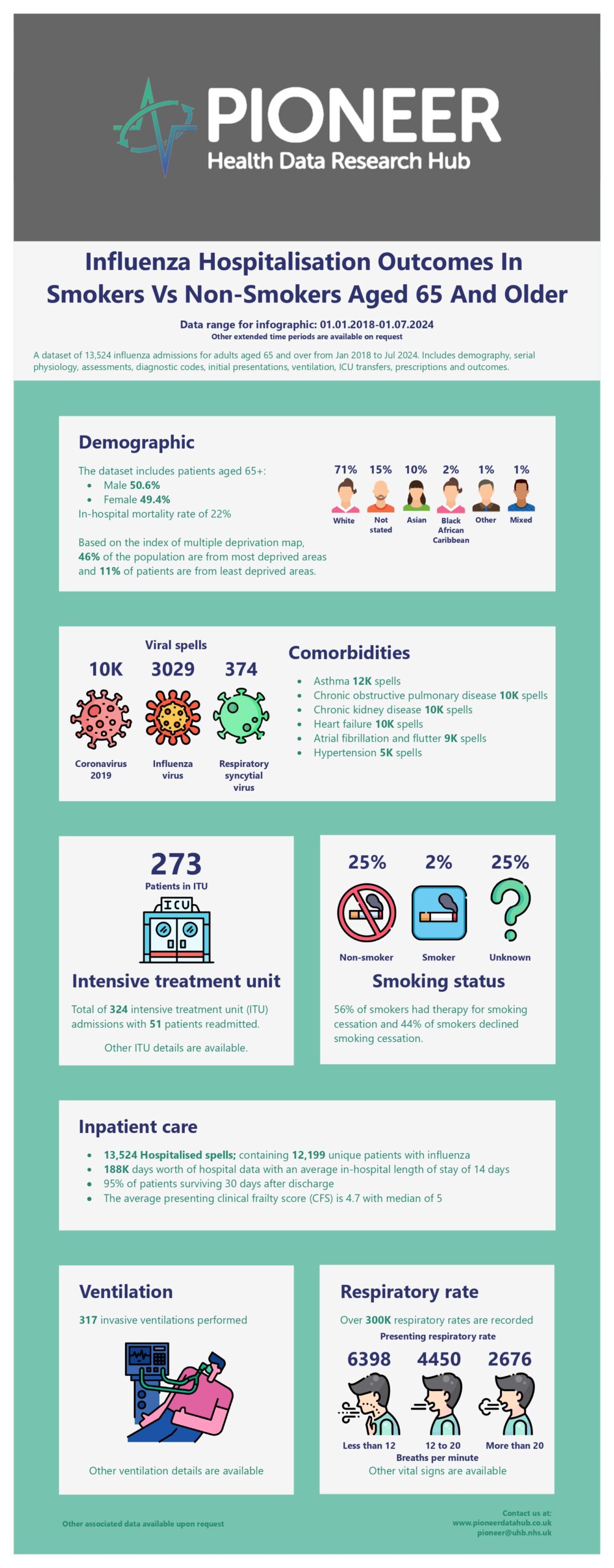 This dataset includes 13,524 influenza-related hospital admissions from January 2018 to July 2024, focusing on individuals aged 65 and older. It contains demographics, serial physiology, clinical assessments, diagnostic codes (ICD-10 and SNOMED-CT), initial presentations, ventilation, ICU transfers, prescriptions, and outcomes. While a dataset for all ages is available, this subset emphasizes older adults, who are at greater risk of severe complications, particularly from smoking.