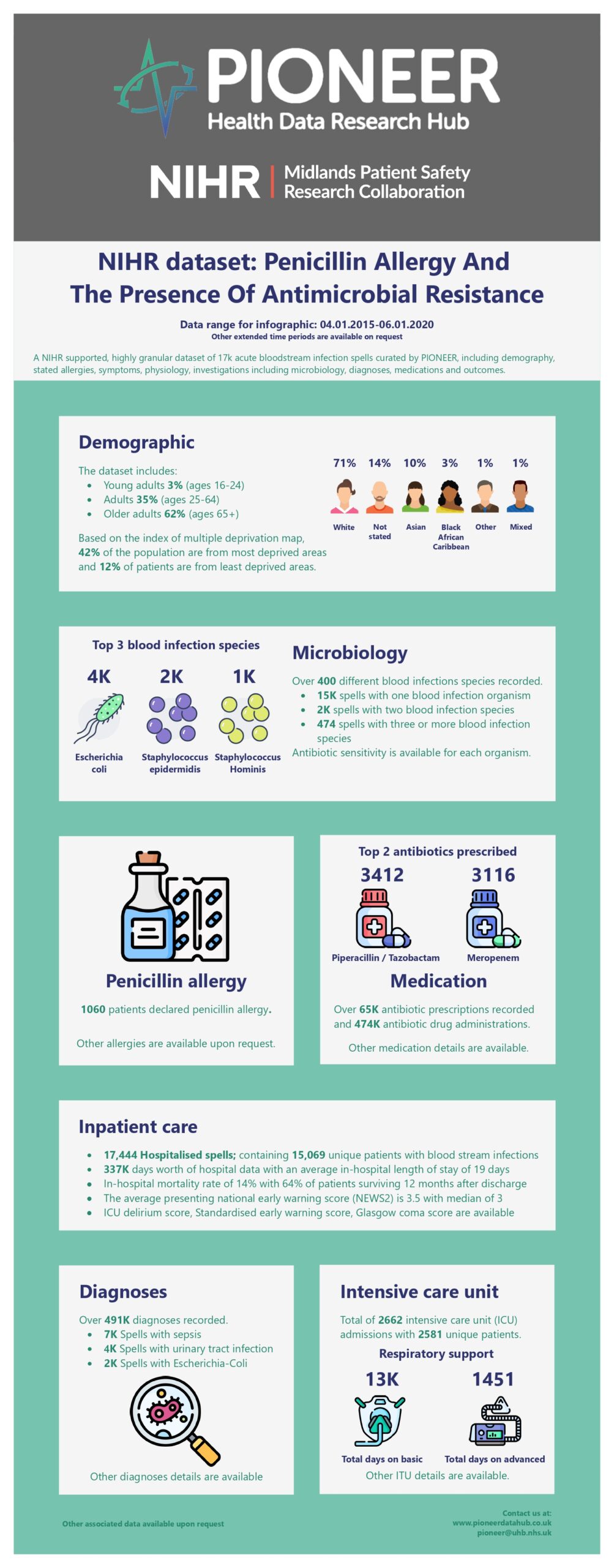 To investigate this (and related questions) PIONEER has curated a highly granular dataset of 17444 acute blood steam infection admissions in 15069 patients, supported by the NIHR. The data includes demography, diagnostic codes (ICD-10 & SNOMED-CT), presenting symptoms, serial physiology, investigations including microbiology, treatments and medications, stated allergies, intensive care,) and outcomes. The current dataset includes admissions from 2015 to 2020 but can be expanded to assess other timelines of interest.